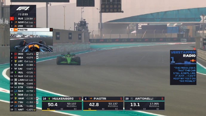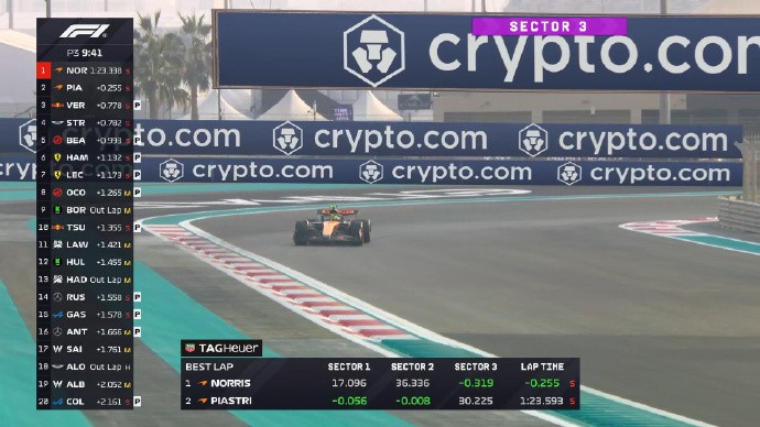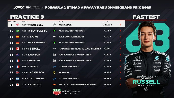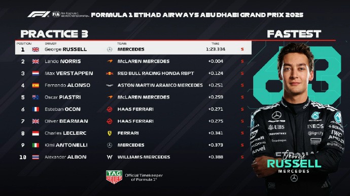 F1阿布扎比三练:拉塞尔全场最快,诺里斯第2,维斯塔潘第3
