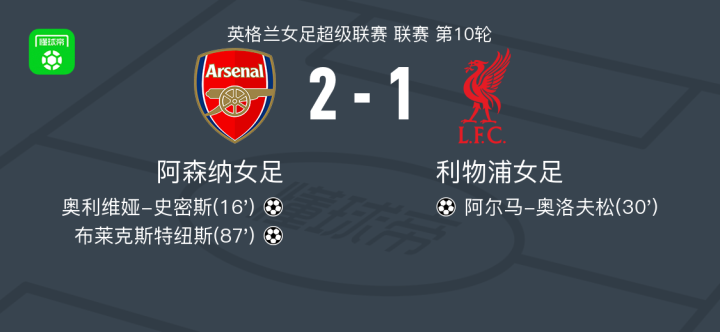 阿森纳女足2-1利物浦女足,布莱克斯特纽斯建功,奥利维娅-史密斯破门