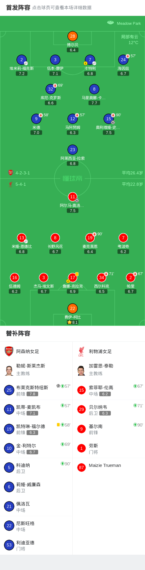北京时间12月6日英格兰女足超级联赛 联赛 第10轮,阿森纳女足主场对阵利物浦女足。阿森纳女足奥利维娅-史密斯破门,布莱克斯特纽斯破门。利物浦女足阿尔马-奥洛夫松破门。最终比分阿森纳女足 2-1 利物浦女足。