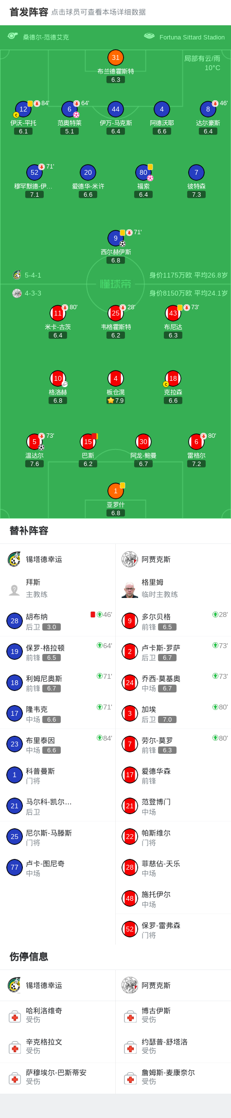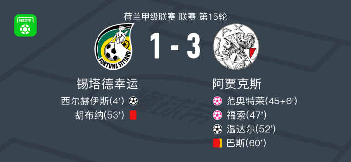 北京时间12月7日,荷兰足球甲级联赛第15轮,锡塔德幸运主场迎战阿贾克斯。比赛伊始,西尔赫伊斯率先破门,为主队取得领先。上半场补时阶段,范奥特莱不慎自摆乌龙,将比分扳平。易边再战,福索再度打入乌龙球,客队实现反超。随后温达尔接格洛赫助攻完成破门,进一步扩大领先优势。比赛中段,胡布纳被红牌罚下,锡塔德幸运陷入人数劣势。之后巴斯累计两张黄牌被罚出场。最终全场比赛结束,锡塔德幸运1-3不敌阿贾克斯。