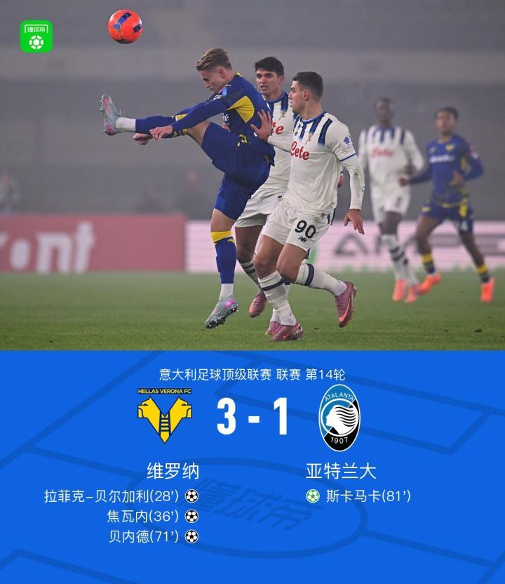 北京时间12月7日,意大利足球顶级联赛第14轮,维罗纳坐镇主场迎战亚特兰大。比赛中,维罗纳率先打破僵局,丹尼尔-莫斯克拉送出助攻,拉菲克-贝尔加利完成破门。随后,焦瓦内凭借个人能力再下一城,帮助主队扩大领先优势。下半场,焦瓦内再次发挥作用,送出精准助攻,贝内德接球后冷静施射得手。亚特兰大在比赛末段由斯卡马卡罚入点球扳回一城。最终,维罗纳以3比1战胜亚特兰大,全取三分。