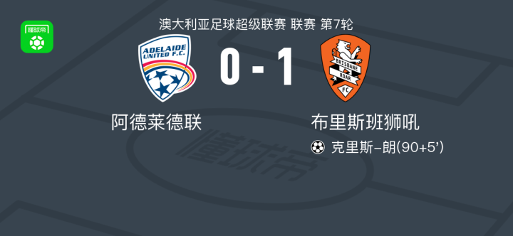 北京时间12月7日,澳大利亚足球超级联赛第7轮,阿德莱德联主场迎战布里斯班狮吼。下半场补时阶段,布赞尼斯送出助攻,克里斯-朗破门得分。凭借此球,布里斯班狮吼客场1比0战胜阿德莱德联。