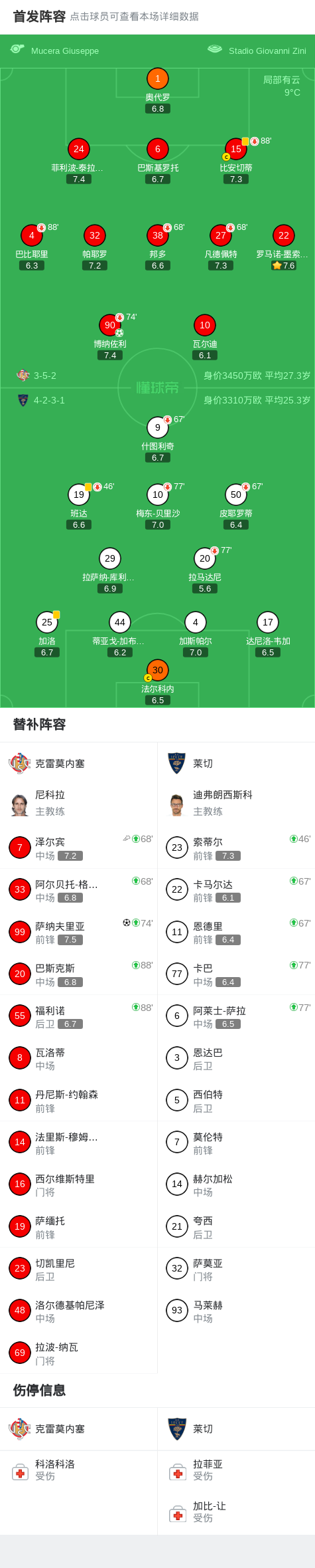 克雷莫内塞2-0莱切,博纳佐利建功,萨纳夫里亚锁定胜局