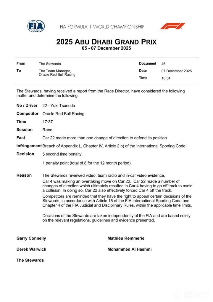 FIA:角田多次变线导致5秒罚时,诺里斯为躲避接触赛道外超越