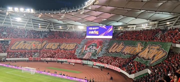 这场足协杯决赛正式打响前,河南队球迷在苏州奥体中心看台上打出了震撼的巨幅TIFO——United as one,we make history。(团结一心,创造历史)