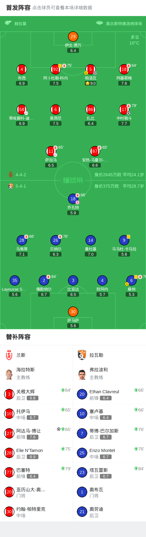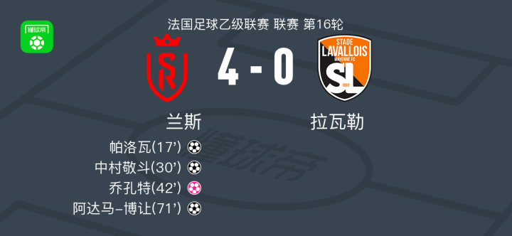 北京时间12月9日,法国足球甲级联赛第16轮,兰斯坐镇主场迎战拉瓦勒。比赛中,萨拉马送出助攻,帕洛瓦率先打破僵局。随后蒂埃莫科-迪亚拉精准传球,中村敬斗接球后破门得分,将优势扩大。临近上半场结束,拉瓦勒球员乔孔特不慎自摆乌龙,进一步拉开比分差距。下半场,阿达马-博让抓住机会再入一球,为球队锁定胜局。最终全场比赛结束,兰斯以4比0战胜拉瓦勒。