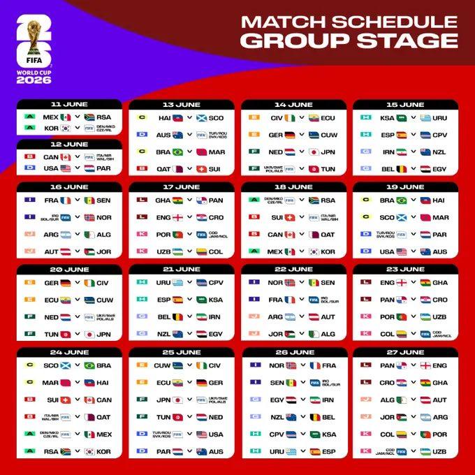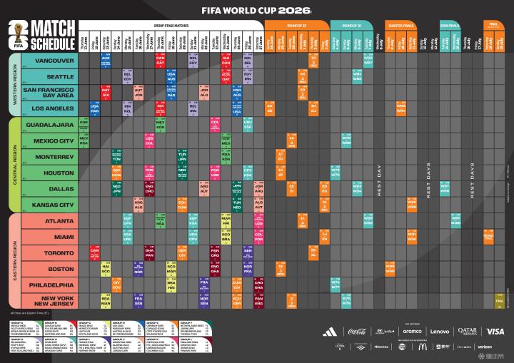 分组情况 A组:墨西哥、南非、韩国、欧洲区附加赛D队 B组:加拿大、欧洲区附加赛A队、卡塔尔、瑞士 C组:巴西、摩洛哥、海地、苏格兰 D组:美国、巴拉圭、澳大利亚、欧洲区附加赛C队 E组:德国、库拉索、科特迪瓦、厄瓜多尔 F组:荷兰、日本、欧洲区附加赛B队、突尼斯 G组:比利时、埃及、伊朗、新西兰 H组:西班牙、佛得角、沙特阿拉伯、乌拉圭 I组:法国、塞内加尔、洲际附加赛2队、挪威 J组:阿根廷、阿尔及利亚、奥地利、约旦 K组:葡萄牙、洲际附加赛1队、乌兹别克斯坦、哥伦比亚 L组:英格兰、克罗地亚、加纳、巴拿马 目前,仍有 6支参赛球队 尚未确定。其中4个名额来自欧洲区附加赛,2个来自洲际附加赛,这些比赛将于2026年3月举行。 值得注意的是,若意大利队从欧洲区附加赛中晋级,它将落位至B组。而伊拉克队若从洲际附加赛晋级,则将进入I组。 本届世界杯采用的全新赛制,也是理解“无死亡之组”的关键。48支球队分为12个小组,每个小组的前两名(共24队)以及8个成绩最好的小组第三名将晋级32强淘汰赛。 这一出线规则大大降低了小组赛的残酷性,使得传统意义上“死亡之组”出现的概率显著降低。 根据抽签结果,法国队与挪威队在I组狭路相逢。这意味着当今足坛最受瞩目的两位新生代巨星——姆巴佩和哈兰德,将在小组赛阶段就迎来直接对话。 另一个潜在的重磅对决则可能发生在淘汰赛。根据赛程分析,如果阿根廷队和葡萄牙队在各自小组均以头名出线,并顺利赢下两轮淘汰赛,那么两队将在四分之一决赛相遇。 在L组,英格兰与克罗地亚将再次相遇。两队曾在2018年世界杯半决赛中有过经典交锋,此次小组赛重逢无疑将勾起无数球迷的回忆。 本届世界杯的揭幕战安排也颇具历史意味。A组的墨西哥队和南非队将于2026年6月11日在墨西哥城打响本届赛事的第一战。这将是两队自2010年世界杯后,再次在世界杯揭幕战交手。