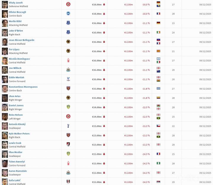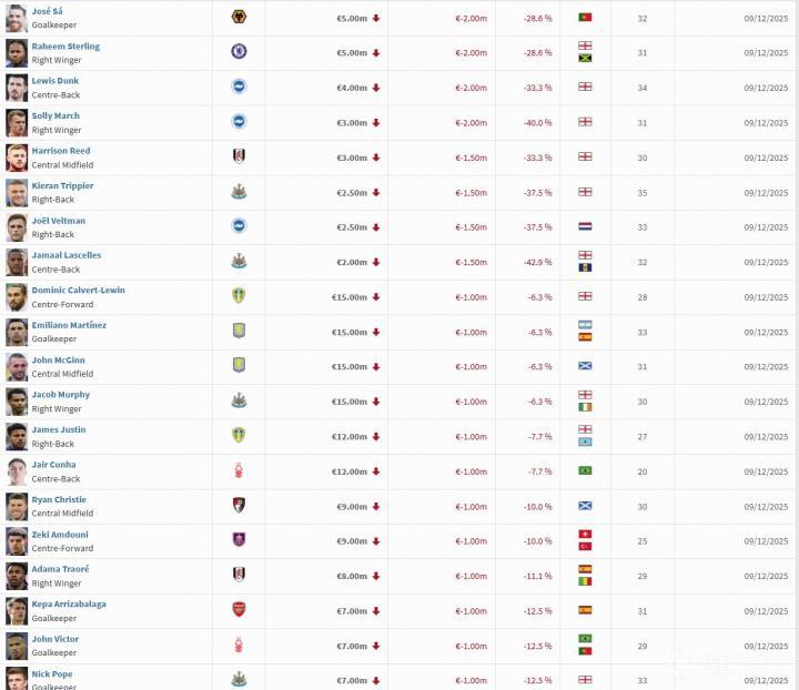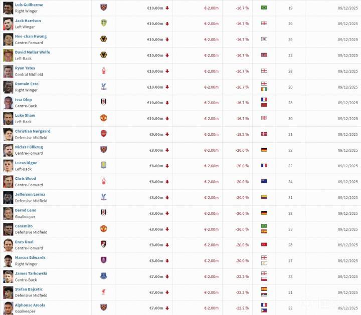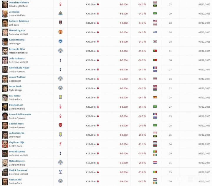北京时间12月9日,德国转会市场进行了最新一期的英超身价更新。