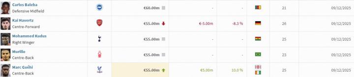 哈弗茨 (阿森纳) 5500万欧 下跌500万欧