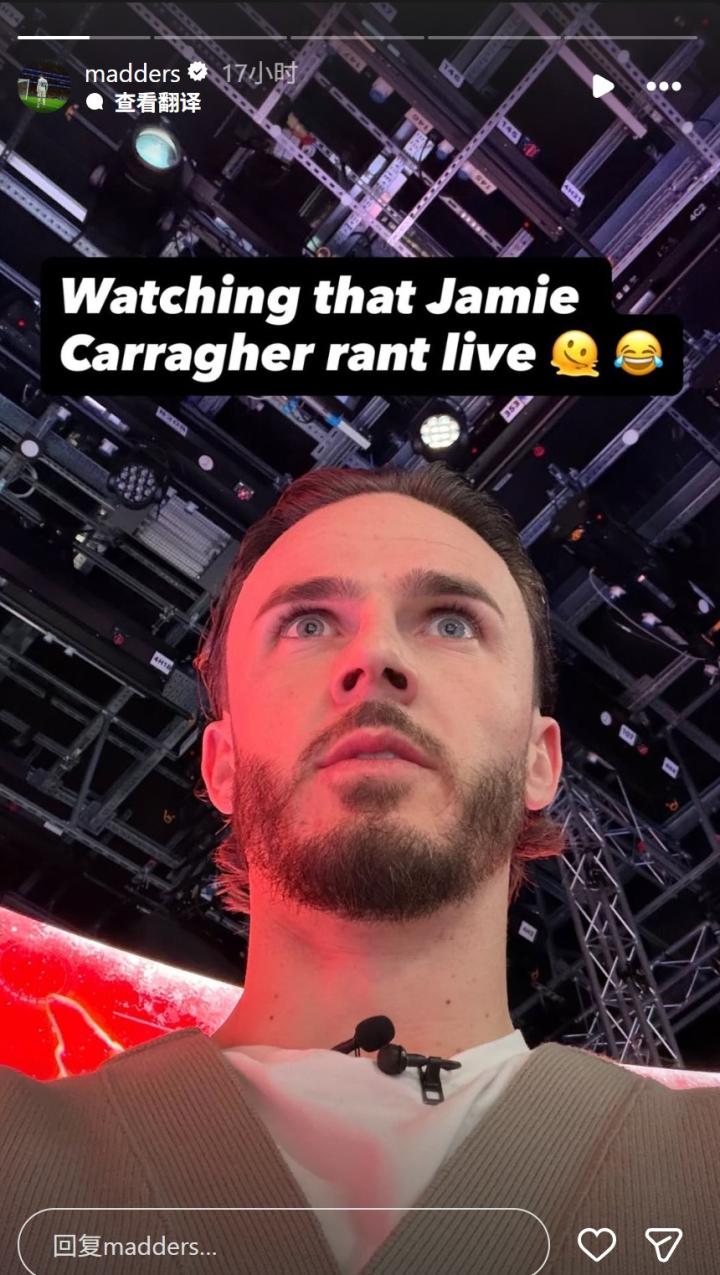 麦迪逊在社媒晒出了一张自己一脸震惊的自拍,并配文:“我在现场观看卡拉格开炮😂”