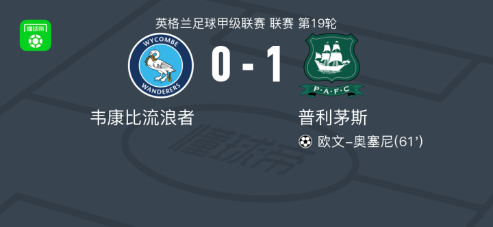 北京时间12月10日,英格兰足球甲级联赛第19轮,韦康比流浪者主场迎战普利茅斯。比赛中,普利茅斯球员欧文-奥塞尼攻入全场唯一进球,帮助球队取得领先。凭借此次破门,普利茅斯客场1比0战胜韦康比流浪者。