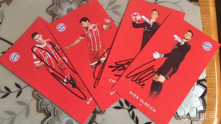 dachaoqianming2.25日,在信荒长达一个多月后,终于收到了本赛季拜仁的第二封回信。这封信周期长达半年。信封上显示的时间是2.6号从德国寄出的,经过两个礼拜才到我手里。而在信里面,我要了诺伊尔、乌尔赖希、胡梅尔斯、聚勒以及费吕希特尔的签名。最终拜仁给我回了乌尔赖希、胡梅尔斯、聚勒以及费吕希特尔的签名卡,唯独除了这几张里我最想要的诺伊尔。接下来就让我们欣赏下这些签名。