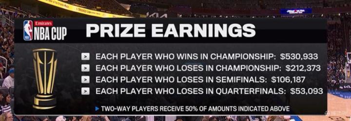 NBA杯奖金安排:晋级淘汰赛每名球员有5.3万美元,冠军53万