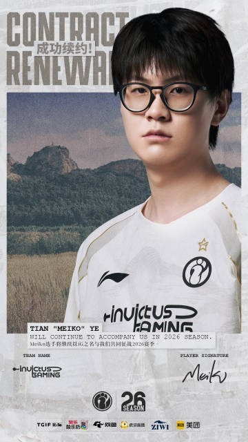 很开心新赛季能够与继续同行,也感谢粉丝们对Meiko选手与iG的关注与支持,愿前路长风相伴,每一步都踏向丰饶之地,每一程都通往星辰阔野。