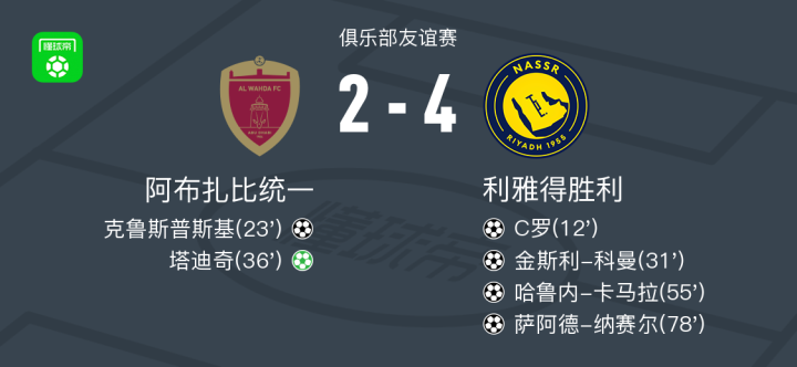 北京时间12月10日,一场俱乐部友谊赛在阿布扎比统一与利雅得胜利之间展开。比赛中,C罗率先为利雅得胜利取得进球,随后克鲁斯普斯基为阿布扎比统一扳平比分。金斯利-科曼接续破门,帮助利雅得胜利再度领先。临近上半场结束,塔迪奇主罚点球命中,将比分再次拉近。下半场,哈鲁内-卡马拉扩大比分优势,随后萨阿德-纳赛尔再入一球锁定胜局。最终全场比赛结束,阿布扎比统一以2比4不敌利雅得胜利。
