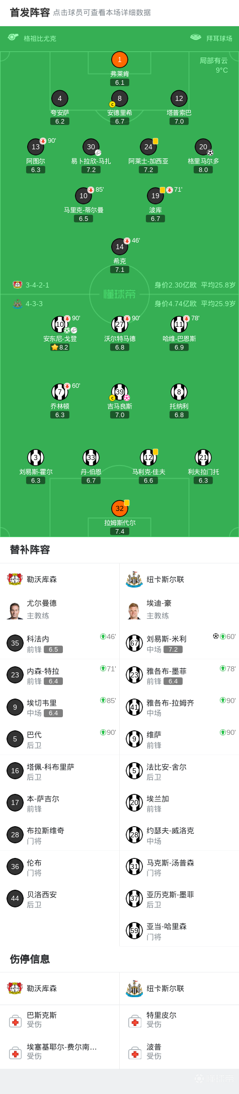 勒沃库森2-2纽卡,戈登传射,吉马良斯乌龙,米利、格里马尔多破门