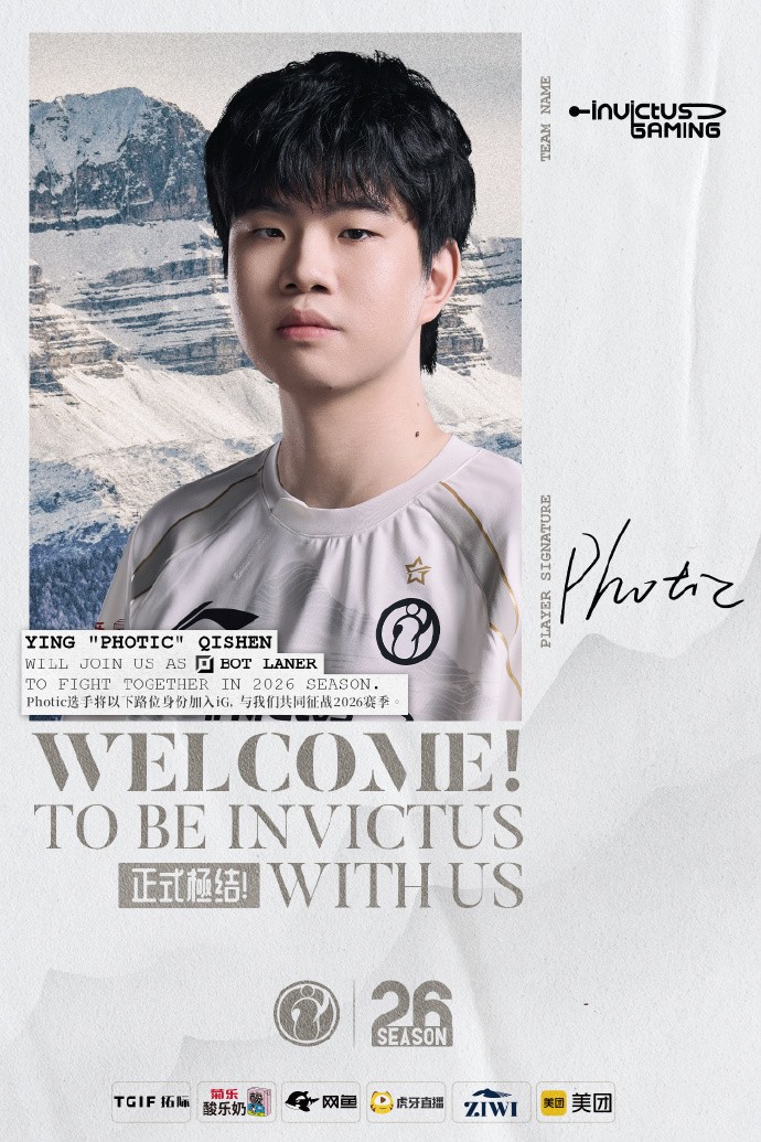 iG官宣四人加入战队,新赛季阵容已经确定Aphelios192025-12-11 19:55北京时间12月11日下午,iG电子竞技俱乐部陆续官宣四名选手的加盟,这四人分别是Photic、Jwei、Soboro和Renard,至此,iG新赛季的阵容已经完全确定。iG新赛季阵容上路:Soboro打野:Wei中路:Rookie/Renard下路:Photic辅助:Meiko/Jwei相关阅读【官方:iG与中单选手Rookie续约至2027年,辅助选手Meiko同样续约】【官方:iG与队内打野选手Wei完成续约】【官方:iG上路选手TheShy将在新赛季暂离赛场】展开更多