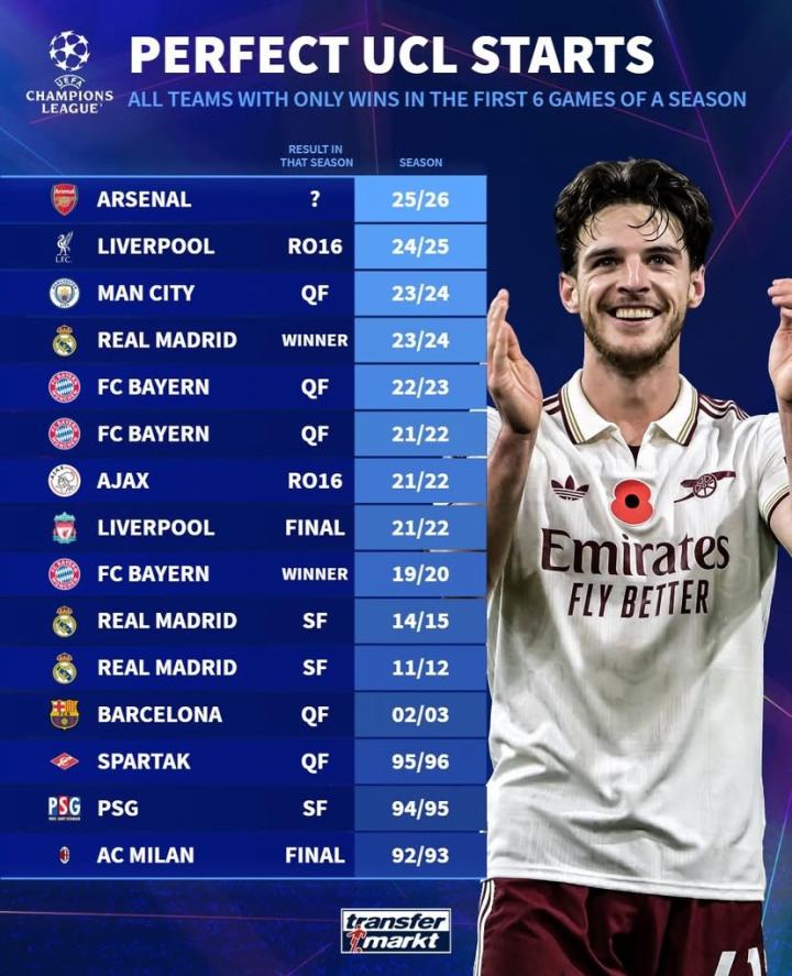 过往欧冠14次出现单赛季前6战全胜球队,最终仅2队夺冠
