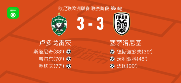 卢多戈雷茨3-3塞萨洛尼基,斯塔尼奇首开记录,迈图救主