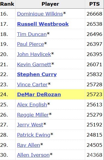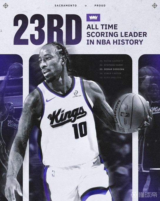 德罗赞超卡特升历史总得分榜第23位,仅差第22位库里100分左右尼古拉约基奇 @懂球帝2025-12-12 12:32北京时间今日,萨克拉门托国王队在主场迎战丹佛掘金队。在比赛上半场,国王后卫德罗赞达成里程碑。在第二节还剩10分05秒时,德罗赞罚球命中拿到本场第6分,超越文斯-卡特(25728分),升至NBA历史得分榜第23位。在德罗赞身前的是勇士球星斯蒂芬-库里,后者以25832分排名历史第22位,两人相差100分左右。展开更多