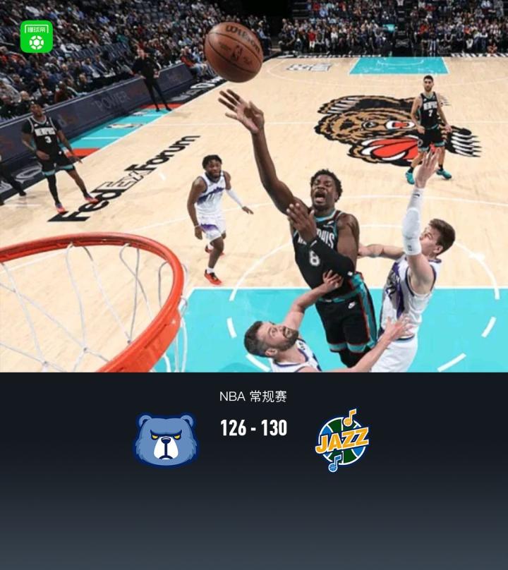 第四节,开节不久,爵士基扬特-乔治与灰熊斯宾塞对飚三分,爵士保持微弱领先,后半节双方继续拉锯,灰熊抓住机会追平比分,最后关键时刻基扬特-乔治冲框再度领先,灰熊莫兰特连续进攻不中,爵士基扬特-乔治罚球锁定胜局,最终灰熊126-130不敌爵士。
