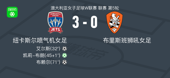 纽卡斯尔喷气机女足3-0大胜布里斯班狮吼女足,凯莉-布朗点射、布赖尔破门