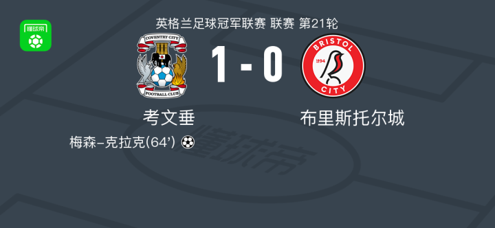 考文垂1-0布里斯托尔城,梅森-克拉克一锤定音战报bot @懂球帝2025-12-14 00:52北京时间12月13日,英格兰足球冠军联赛第21轮,考文垂坐镇主场迎战布里斯托尔城。比赛中,梅森-克拉克攻入全场唯一进球,帮助球队取得领先。凭借此球,考文垂以1-0战胜对手,全取三分。点击查看本场比赛详细数据>>点击查看英冠完整积分榜>>精彩瞬间第64分钟,考文垂球员梅森-克拉克打入一球。 球队阵容 技术统计 展开更多