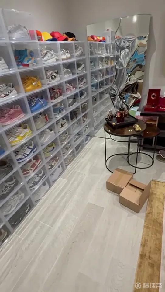 画面中还能看到一整面路易威登包墙,每只价值约5000英镑,比苏马还展示了同品牌价值4000英镑的滑板。另一个房间里,昂贵球鞋被单独陈列,专家认为仅球鞋价值就超过2.1万英镑,其中一双耐克X Off-White AIR Force 1黄金沙色球鞋价格为3106英镑。