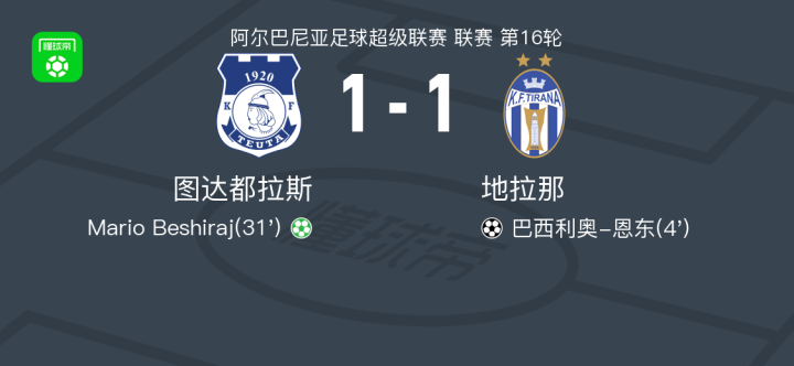 图达都拉斯1-1地拉那,巴西利奥-恩东先拔头筹,Mario Beshiraj救主