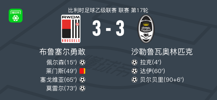 布鲁塞尔勇敢3-3沙勒鲁瓦奥林匹克,拉克先拔头筹,贝尔贝里扳平