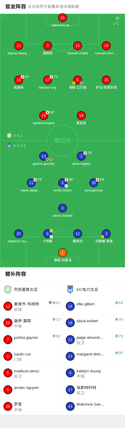 上半场补时第1分钟,DC电力女足球员卡明斯助攻gianna gourley打入一球。