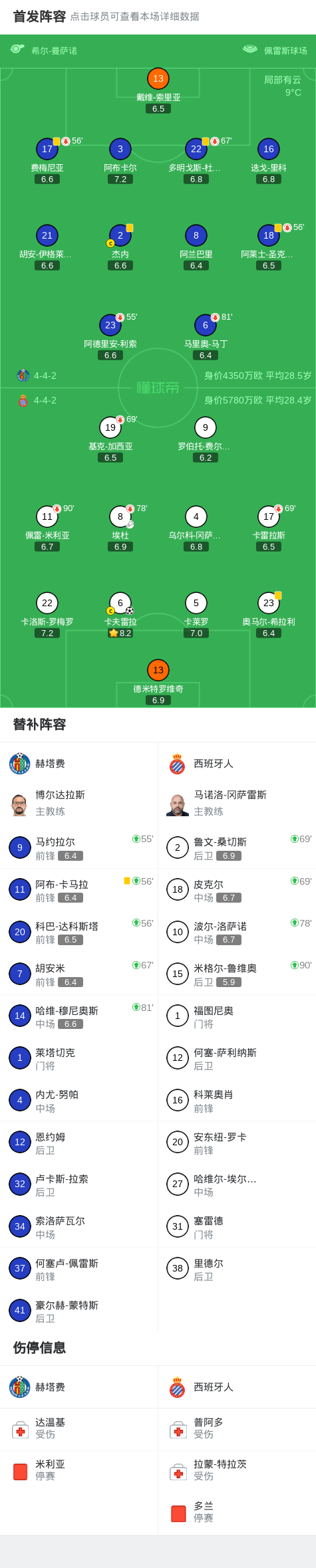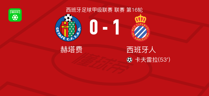 西班牙人1-0赫塔费,卡夫雷拉一击制胜战报bot2025-12-14 05:53北京时间12月14日,西班牙足球甲级联赛第16轮,赫塔费主场迎战西班牙人。比赛中,埃杜送出助攻,卡夫雷拉破门得分,帮助球队取得领先。凭借此粒进球,西班牙人客场1-0战胜赫塔费。点击查看本场比赛详细数据>>点击查看西甲完整积分榜>>精彩瞬间第53分钟,西班牙人球员埃杜助攻卡夫雷拉打入一球。 球队阵容 技术统计 展开更多