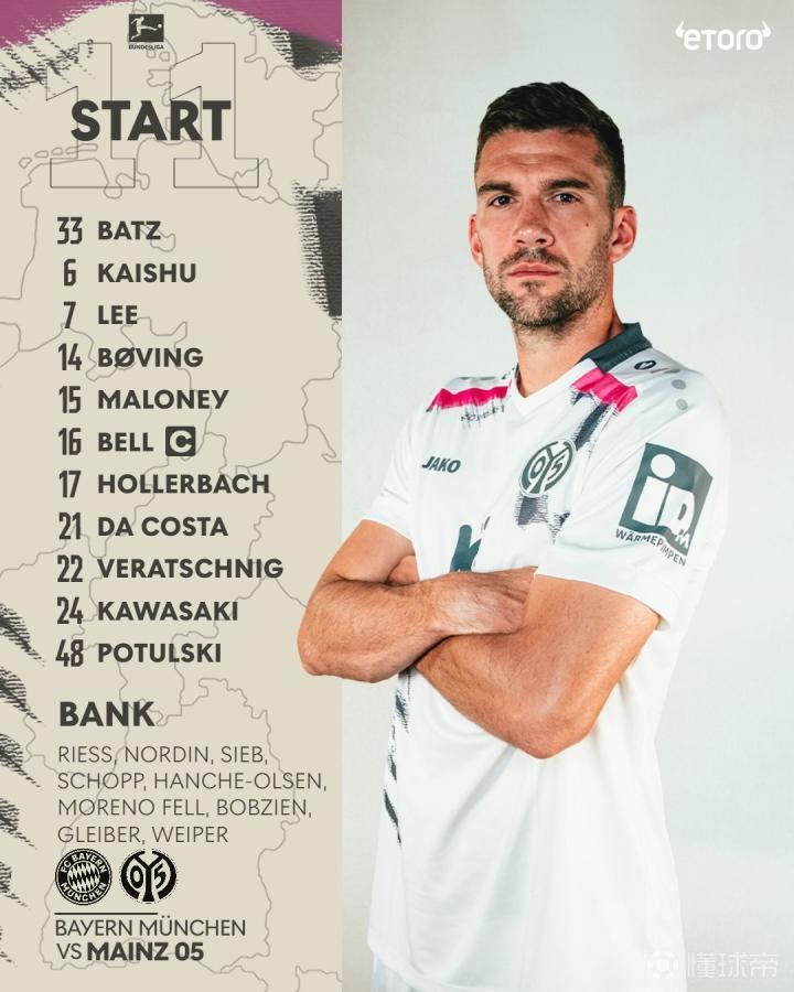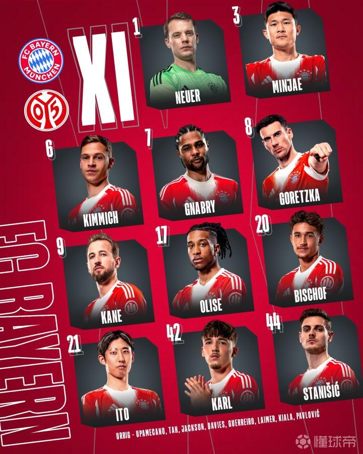 拜仁vs美因茨:凯恩领衔,伊藤洋辉、金玟哉、卡尔出战