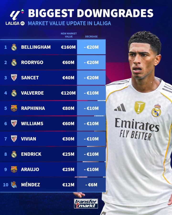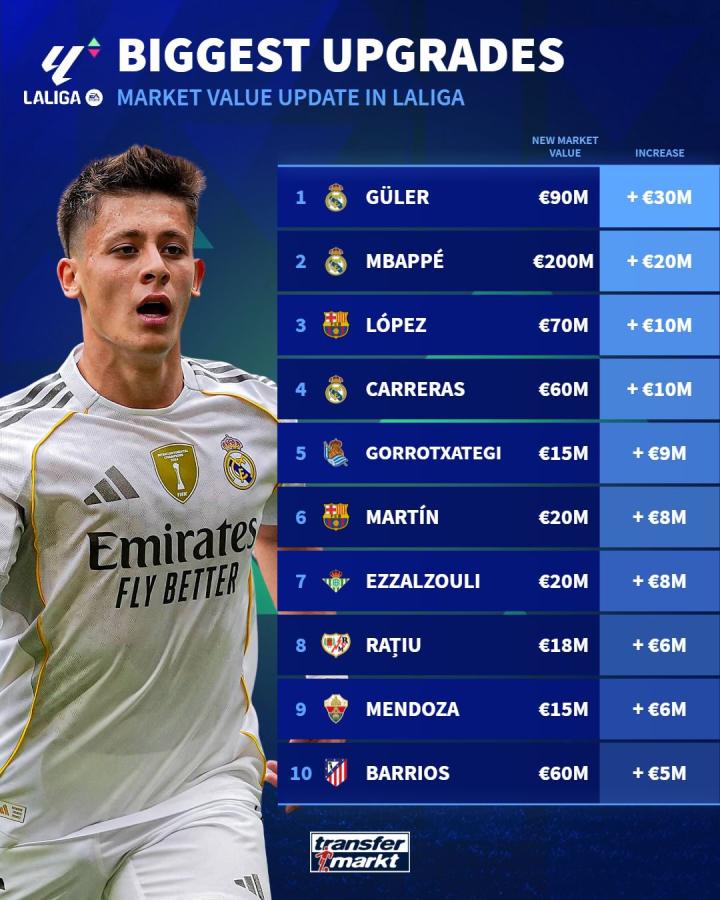 西甲联赛更新之后,身价上升最多和下降最多的球员排行榜: