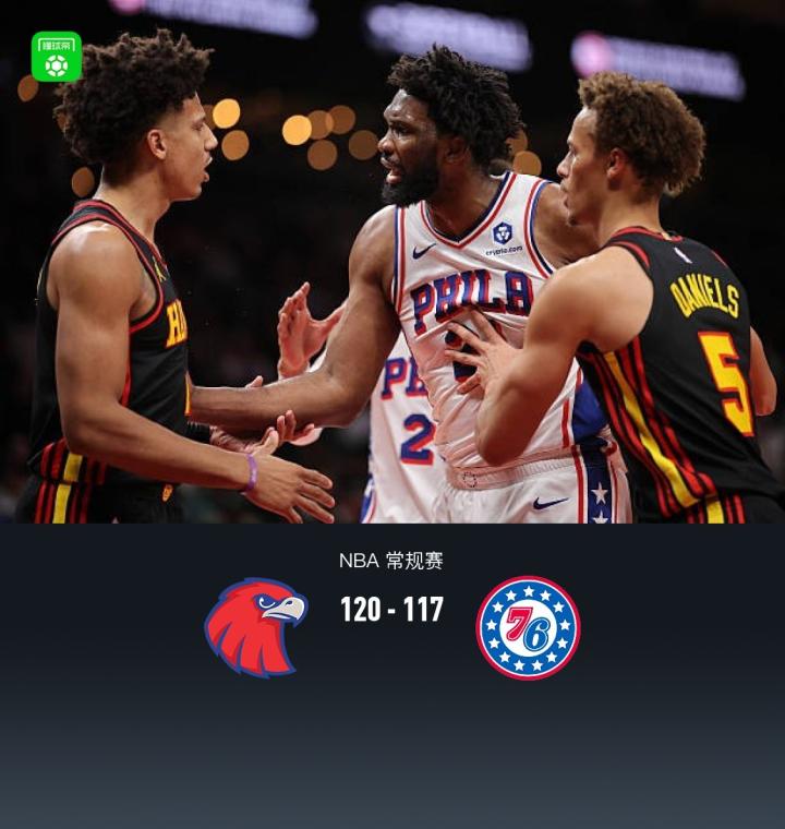 北京时间12月15日,NBA常规赛,亚特兰大老鹰对阵费城76人。半场老鹰59-55领先76人,最终老鹰120-117战胜76人。