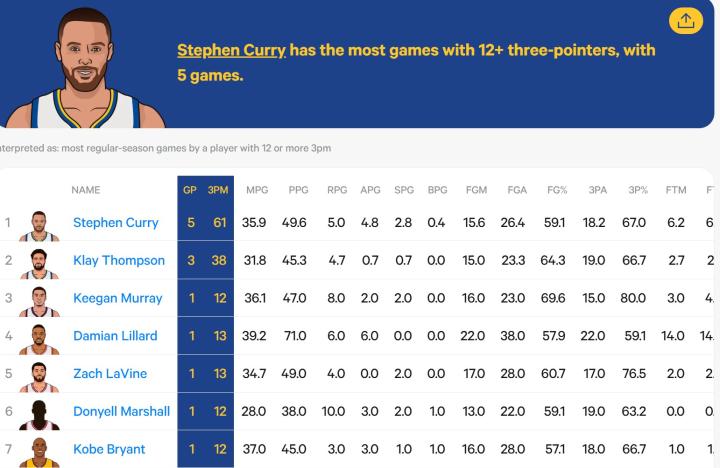 本场比赛库里轰进了12记三分球,在NBA历史上仅有7名球员有过这样的表现,同时只有库里(5次)和克莱-汤普森(3次)有过不止一场单场三分球至少12记的表现。