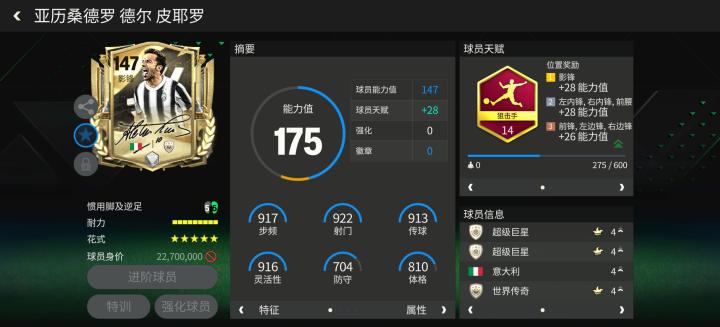 皮耶罗共为尤文图斯效力19个赛季,代表球队在705场比赛中打进290粒进球,助攻143次,是尤文图斯队史第一射手。辉煌时代活动中,他的全新球员卡配备了狙击手天赋。花式方面,高级油炸丸子搭配五星花式星级让他的持球能力达到版本顶级。