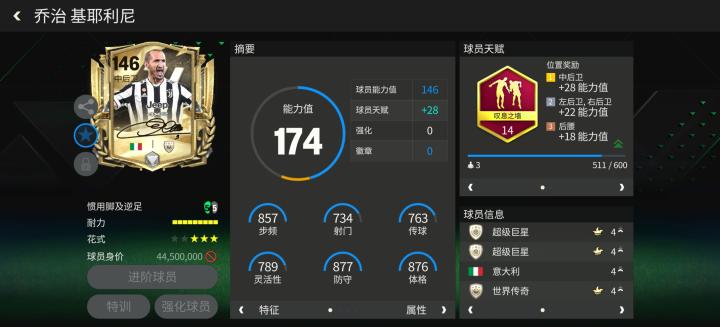 基耶利尼在巅峰期是意大利和尤文图斯的双料后场核心,他与博努奇组成的“玄冥二老”中卫搭档还曾在2021年帮助意大利登上欧洲之巅。本次辉煌时代活动中,他推出的球员卡配备了叹息之墙天赋,提升了他的加速、人盯人、拦截等多项重点数据。