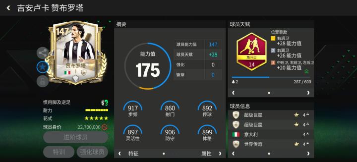 赞布罗塔是意大利队史最伟大的边后卫,他曾随队夺得两次意甲冠军、一次欧冠冠军。辉煌时代活动中,赞布罗塔配备了角斗士天赋,对他的长传、短传数据提升显著。花式方面,五星花式星级搭配马赛回旋的配置让他拥有了优秀的边路推进能力