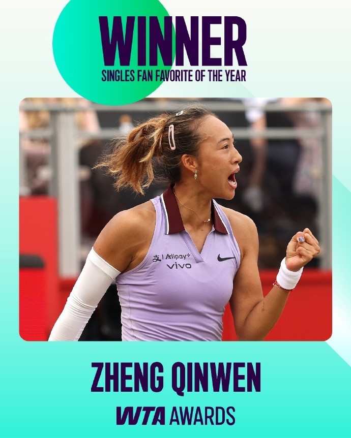 郑钦文再获WTA最受欢迎球员奖,连续第二年位列人气榜首