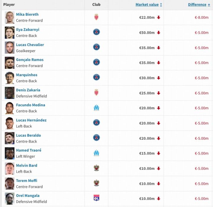 法甲身价跌幅榜