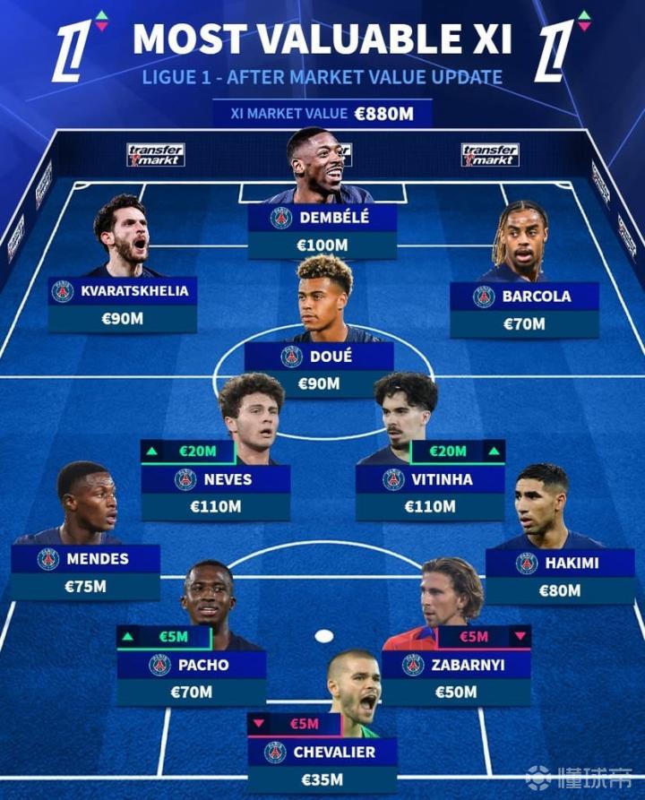 法甲最贵11人阵容:巴黎包揽,维蒂尼亚、内维斯1.1亿欧领衔
