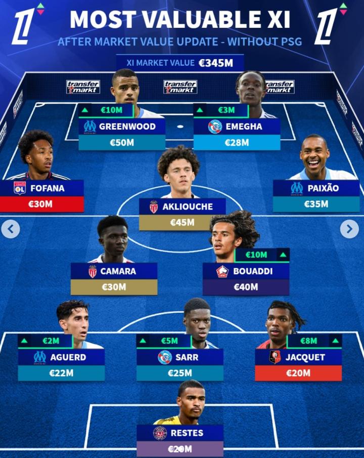 德转今日更新了法甲球员的最新身价,并列出了一套没有巴黎球员的最贵阵容,格林伍德领衔,布阿迪在列。