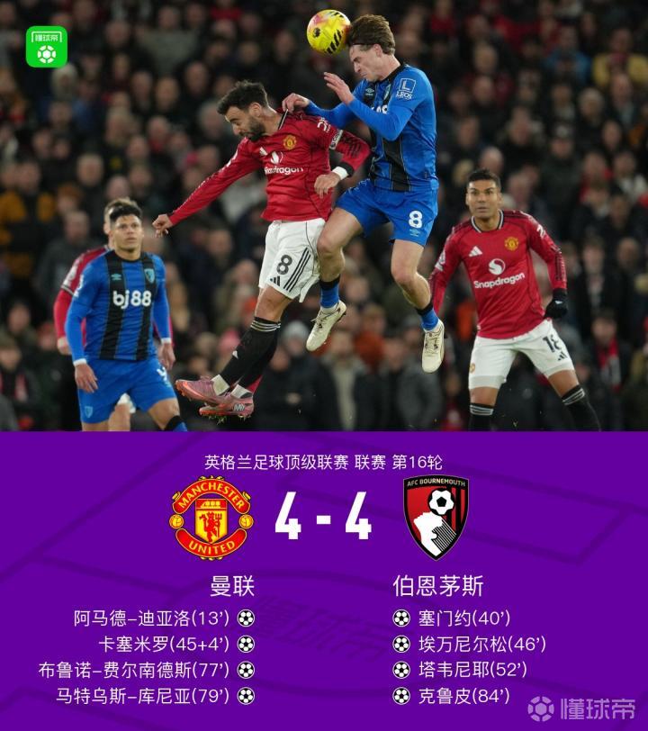北京时间12月16日,英格兰足球超级联赛第16轮,曼联坐镇主场迎战伯恩茅斯。上半场,迪亚洛首开记录。塞门约扳平比分,卡塞米罗利用角球头槌建功。下半场,塔韦尼耶助攻,埃瓦尼尔松得分。随后,塔韦尼耶任意球直接破门。B费任意球同样轰入死角,库尼亚低射为曼联再次取得领先。不过,克鲁皮建功为伯恩茅斯扳平比分。全场比赛结束,曼联在一场进球大战中4-4战平伯恩茅斯。