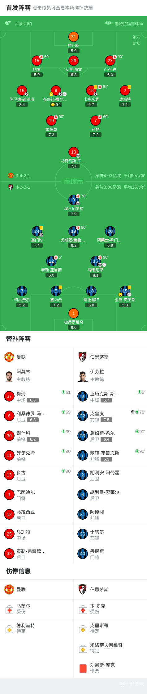 第41分钟,卢克-肖被抢断,塞门约低射扳平比分,伯恩茅斯1-1
