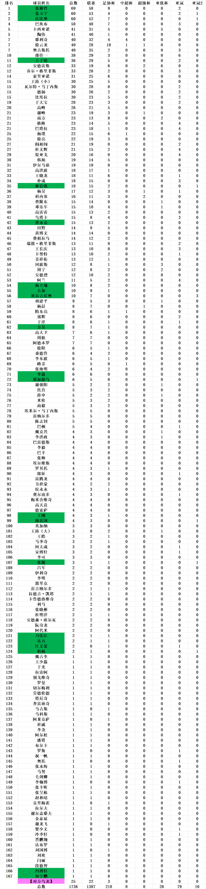 张玉宁今年打进9球,成为队史首位在至少6个赛季都打进6球的球员,距离榜首的张稀哲仍有9球差距。