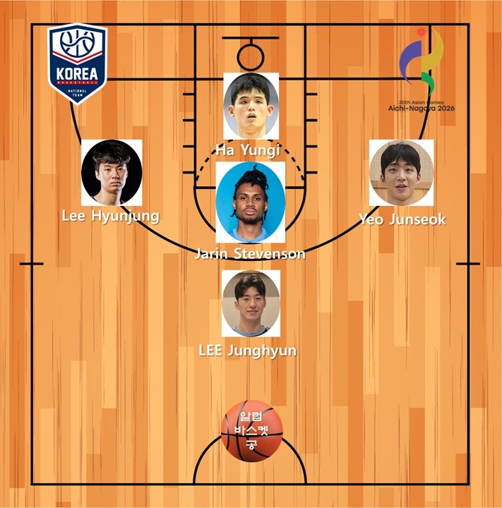 消息称,史蒂文森最早可以在2026名古屋亚运会亮相,届时,韩国男篮可能会凑出一个如下图这样的首发阵容。(河允基、李贤重、史蒂文森、吕俊锡、李政炫)