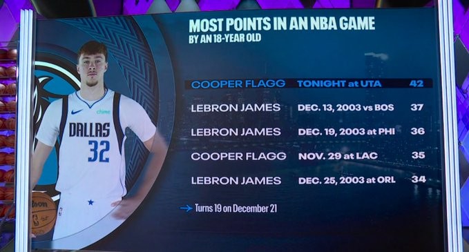 此外,18岁359天的弗拉格成为了NBA历史上首位在18岁时拿到单场40+的球员,他也刷新了詹姆斯保持的NBA历史18岁球员单场得分纪录。