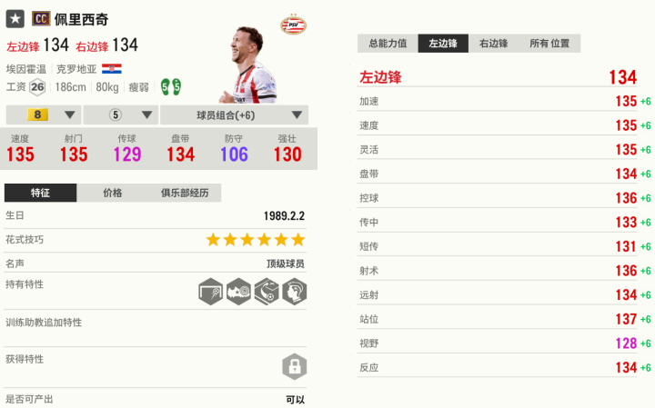 佩里西奇的传中能力强,在拜仁和国米等队套里,他经常被用于下底“锁头”传中。除此之外,佩里西奇自己的射门也值得相信,搓射是他非常擅长的。非常可惜,佩里西奇从CC赛季以后,没有再产出OVR超过109的版本,游戏少了一个顶级边锋。