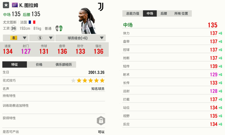 K图拉姆身材高大、体型瘦弱,和博格巴很相像,都是大模型手感灵活的类型。K图拉姆是小六边形战士,在进攻防守两端都能做事,只是都到不了顶尖行列。K图拉姆还是法国和尤文队套里,很稀有的4逆足大模型中场,挺需要一张新赛季版本。